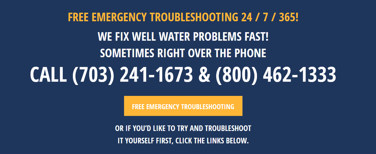 Emergency Well Repair Service and FREE Emergency Troubleshooting. Solve your emergency well water problems, many times over the phone.