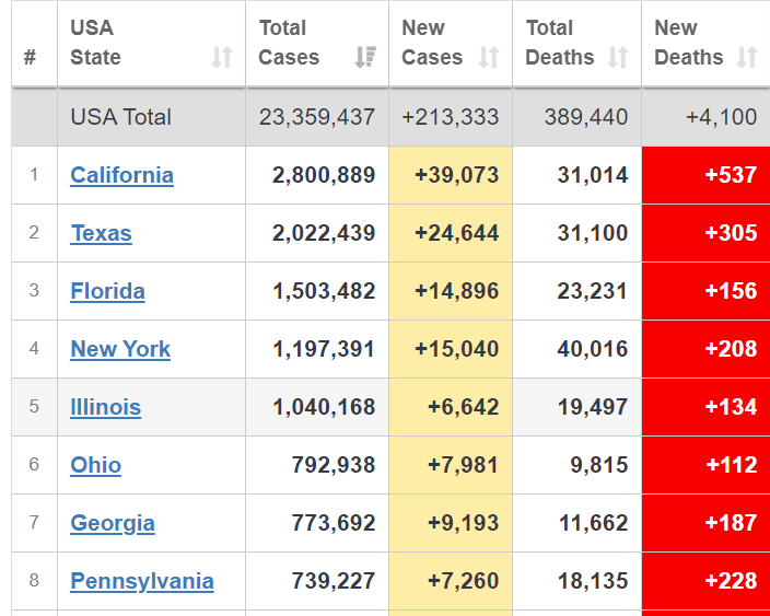 This is 4 Days! Scary numbers... Worldometer: 01/09 - 1/12/2021 11:48AM CST UPDATE - Covid19 USA Cases- 23,177,382 up 1,040,373 Deaths - 386,412 up 12,215 TRUMP = Murder!
