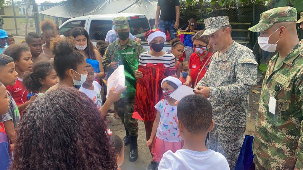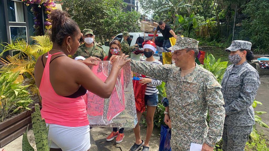 #CaracolInforma | En esta#Navidad2021 uniformados de la@FTC_HERCULES entregaron cientos de regalos y útiles escolares a los niños del barrio la Florida de#Tumaco, Nariño.