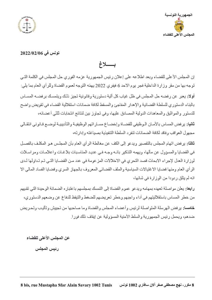#Tunisia Kais Saied announced the dissolution of Tunisia’s High Judicial Council, the last safeguard of the judiciary’s independence.#Tunisie Tunisian president dissolves Supreme Judicial Council https://www.reuters.com/world/africa/tunisian-president-dissolves-supreme-judicial-council-2022-02-06/ … -