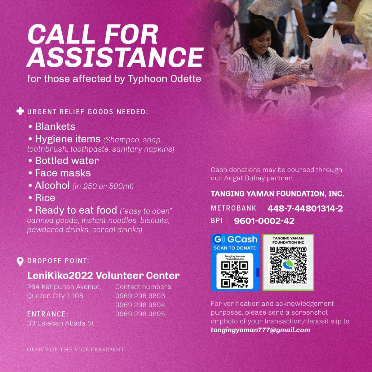 #TyphoonOdette relief ops, guys! Or mag-drop off ng donations. Check out contact deets below. pic.twitter.com/l22RD67RVl