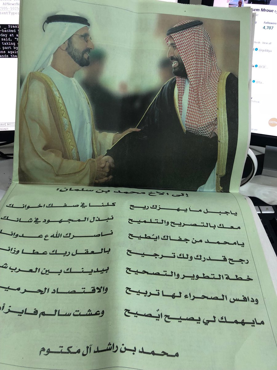 #Saudi daily @aawsat_News has poem written by#UAE Vice President and PM to Saudi Crown Prince Mohammed bin Salman titled “oh mountain you will not be shaken by wind” pic.twitter.com/1zwJjYRhWw