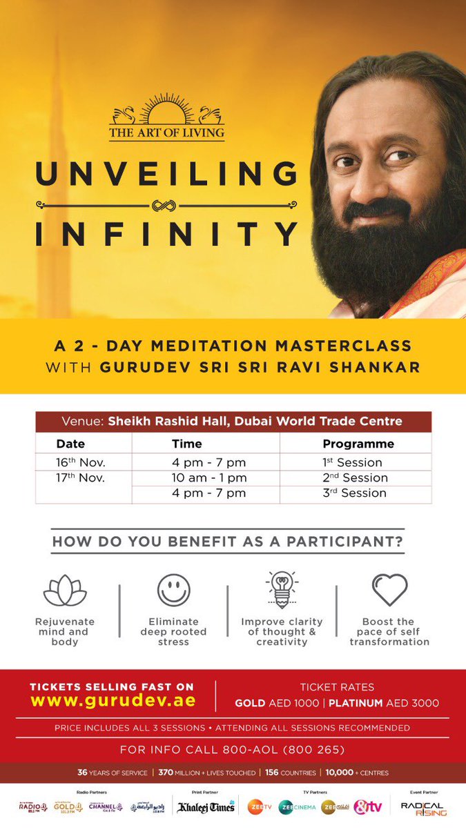 @SriSri in#UAE for the very 1st time. 2 events- 1) An open to all evening of Wisdom, Music and Meditation in#Fujairah 2) A Program called ‘Unveiling Infinity’ in#Dubai Limited seats. Register soon.pic.twitter.com/S6jvi9NdIr