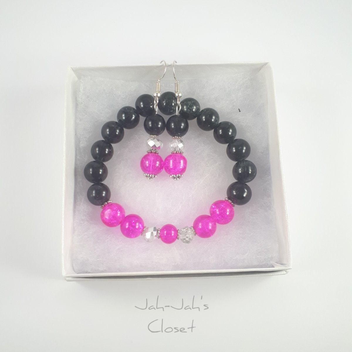 Handmade Black & Pink, Bracelet & Earrings Jewellery Set! This set would make for a lovely unique