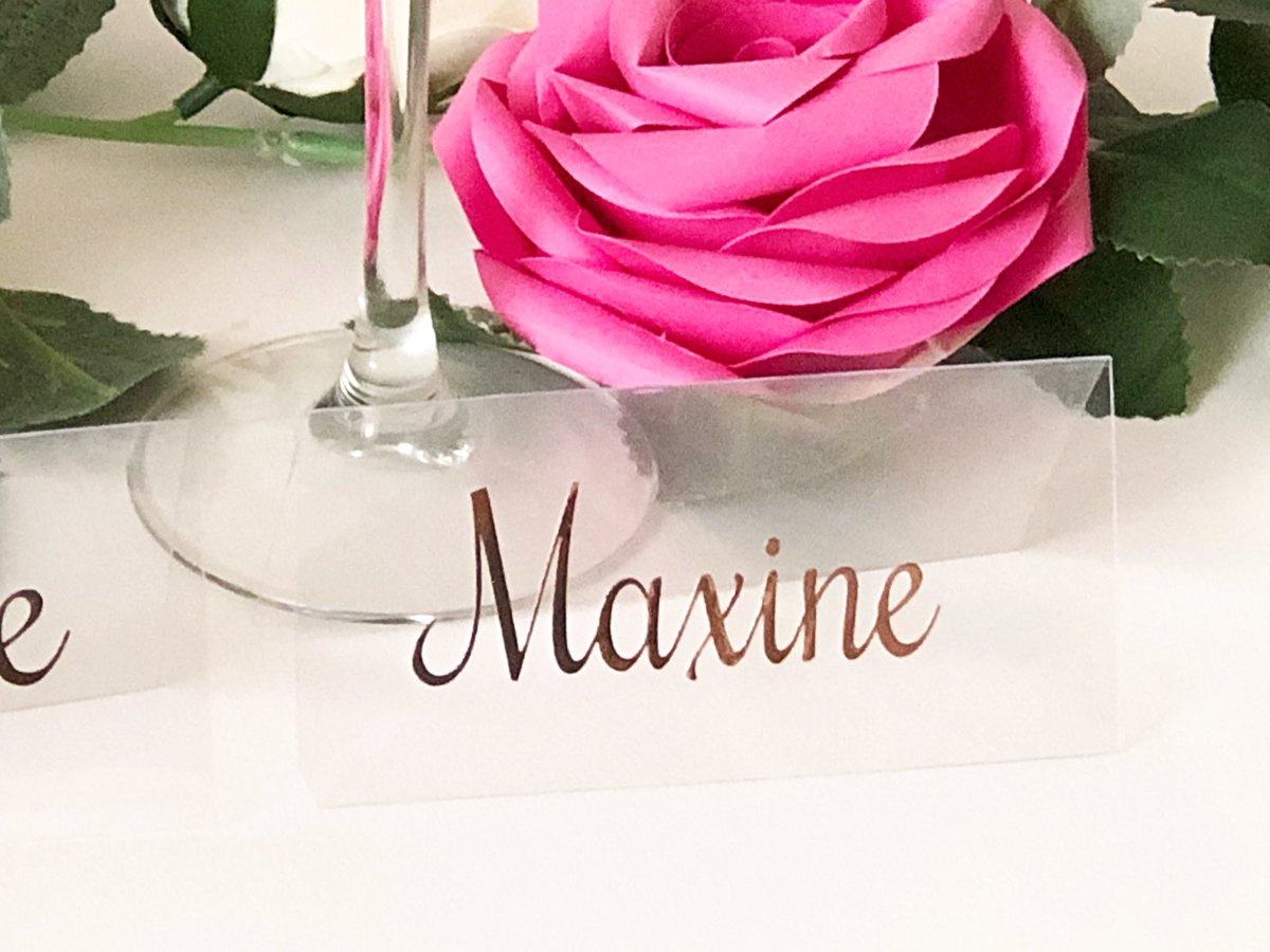 Clear placecard with chrome rosegold text http://bagsoffavours.etsy.com