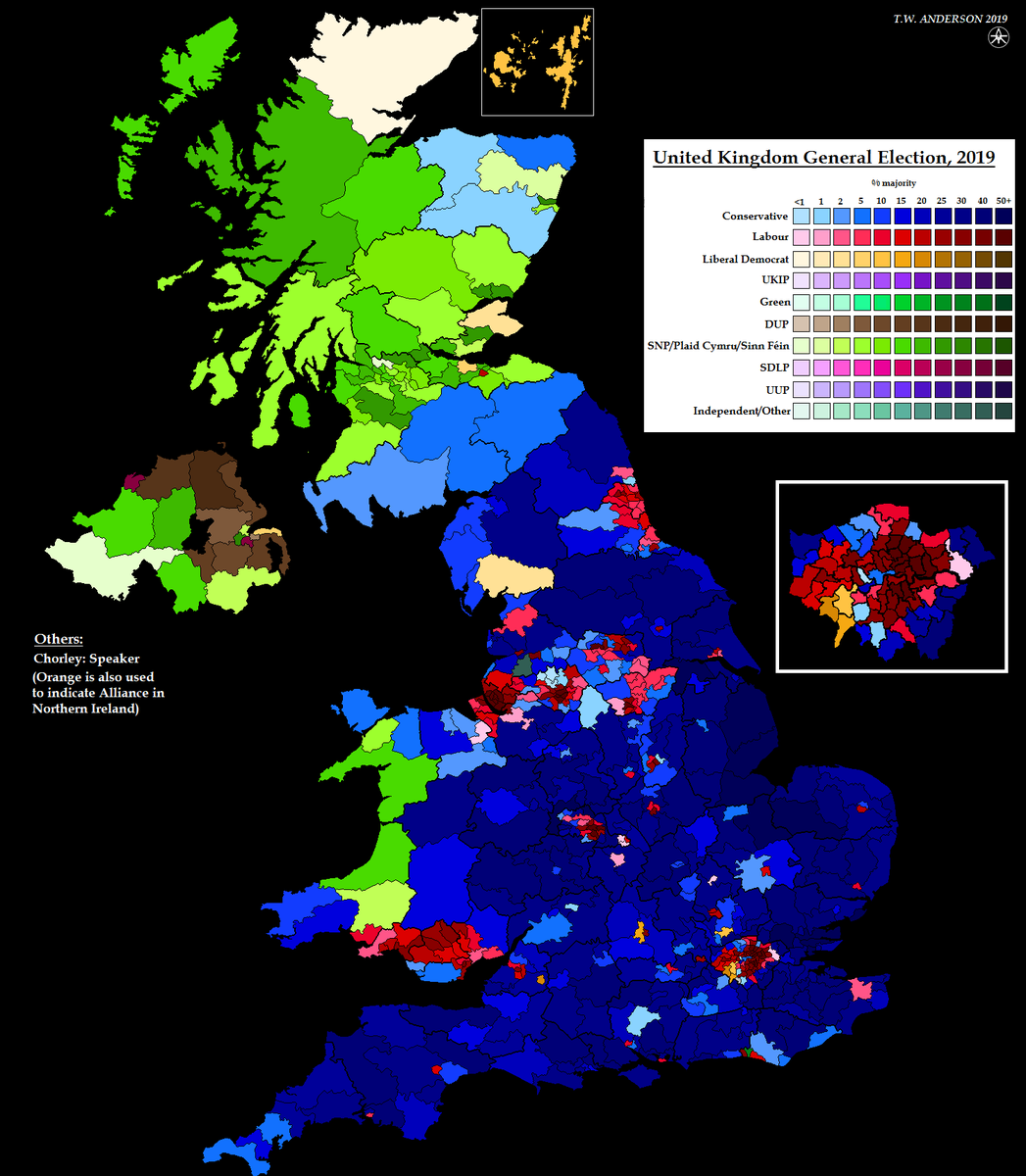 #UKelection2019 result by constituency. A stunning win for the@Conservatives, especially in the North of England - the so-called "red wall" where@UKLabour are traditionally well ahead. Likely Brexit at play - fluke or realignment, only time will tell.pic.twitter.com/CAcyKWXk28