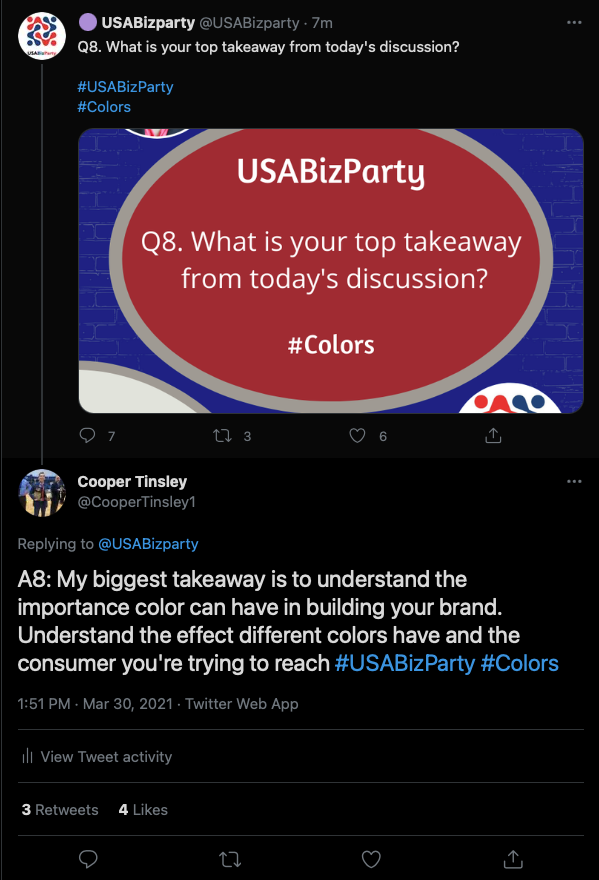 #USABizParty chat today to talk about#colors! Colors weren't something I gave much thought to before, but I've learned how important they are in creating the brand that you want to create. Choosing your brand colors isn't something to take lightly#GSBSocialmediapic.twitter.com/FbK2qFpLAw