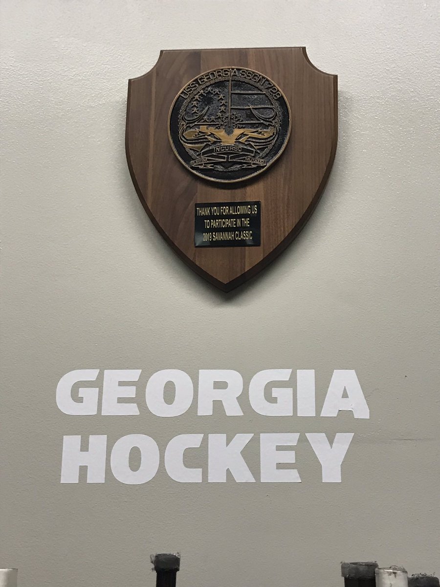 @UGAHockey by the#USSGeorgia crew during the Savannah Hockey Classic is now displayed prominently in the team locker room lobby. The plaque will remind us that#leadership &#teamwork are critical components for success.@USNavy@SECHChockey@SavannahSports pic.twitter.com/P8oFwiNrC6