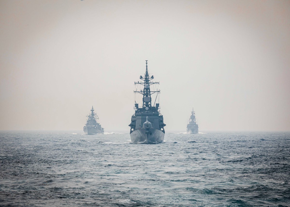 @indiannavy,@Australian_Navy and@jmsdf_pao_eng approach#USSJohnSMcCain during exercise Malabar 2020. The exercise strengthens cooperation among allied forces.