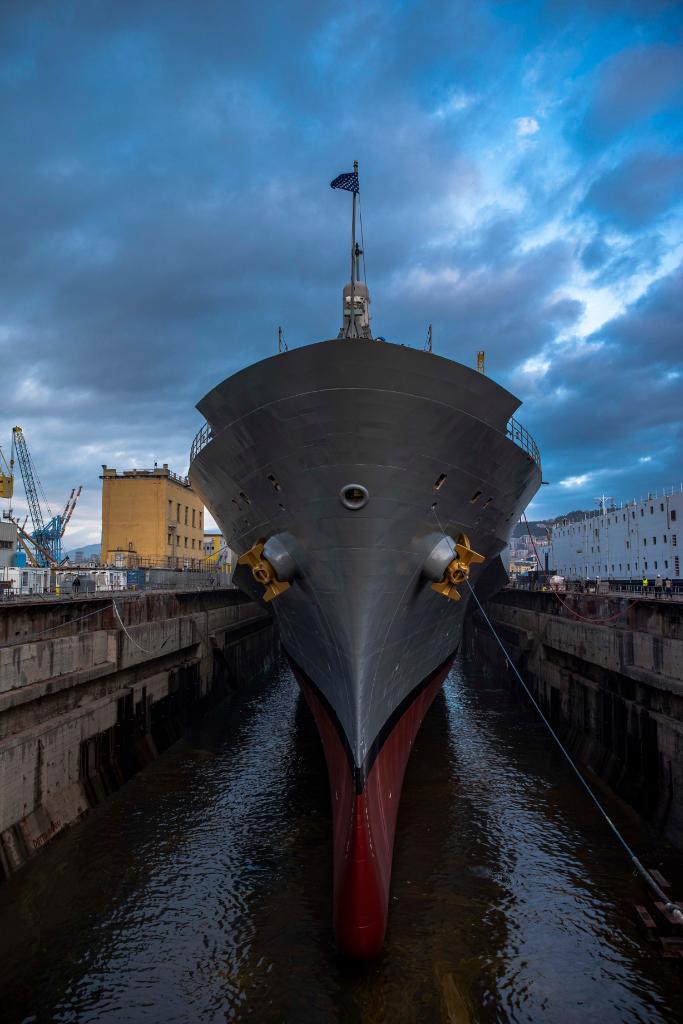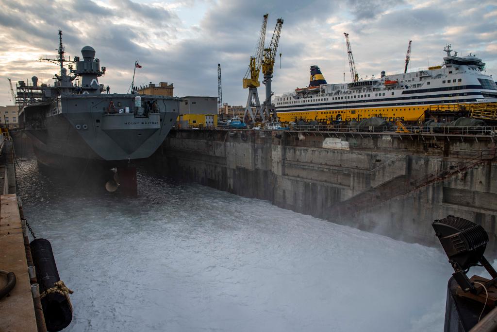 #USNavy's#USSMountWhitney enters dry dock in San Giorgio Del Porto in Genoa, Italy. Mount Whitney, the@USNavyEurope flagship, entered its regularly scheduled overhaul to make improvements in order to increase the security and stability in the region.pic.twitter.com/q4bUBTYnG9