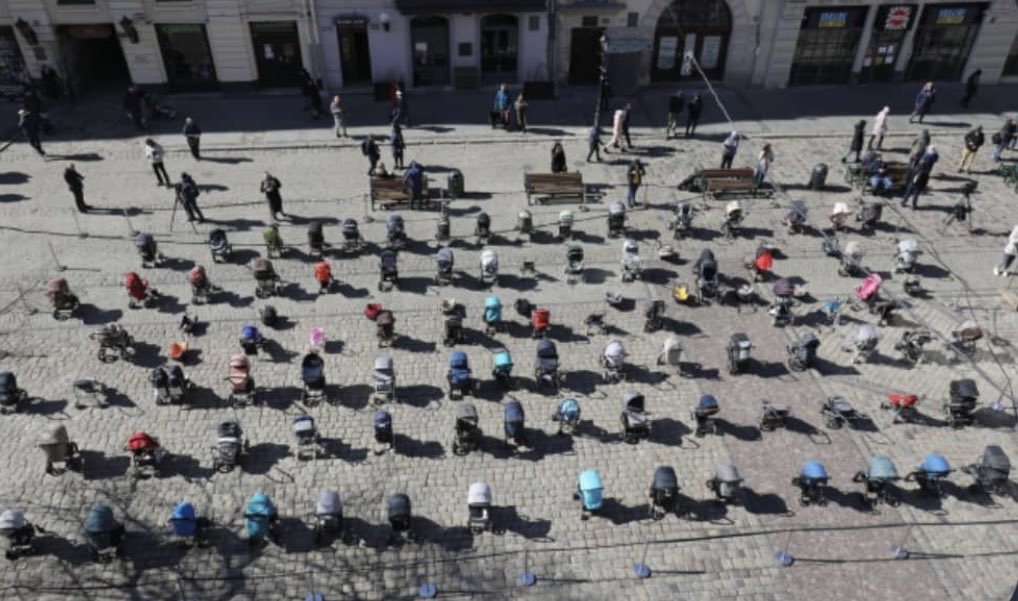 There are 109 empty baby carriages in the Ukrainian city Lviv. They symbolize the 109 Ukrainian children killed by Putin's army