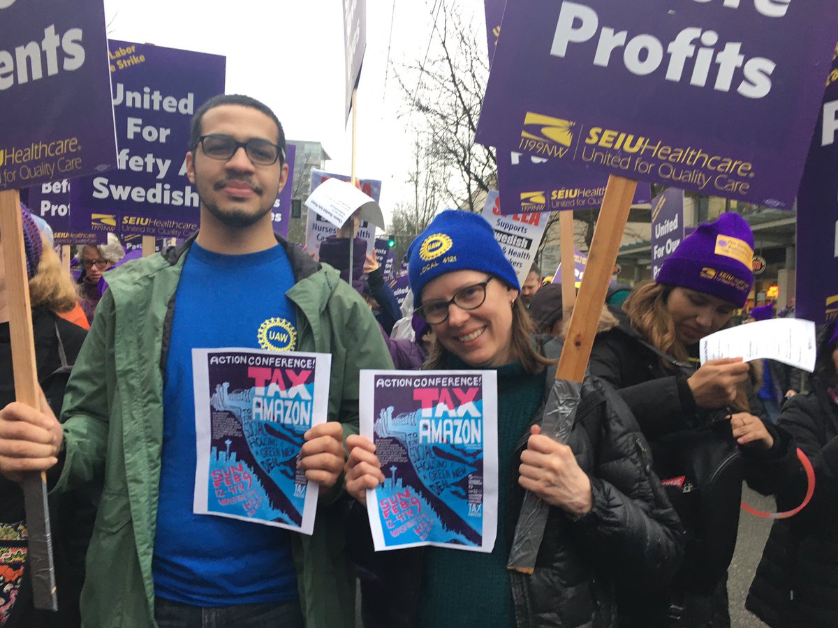 #TaxAmazon stands in solidarity with@SEIU1199NW workers on strike! Your struggle is intimately connected to our fight for#affordablehousing. Workers have the right to live in the city we work in!#UnitedForSafetyatSwedish pic.twitter.com/Ms2giMsNYx