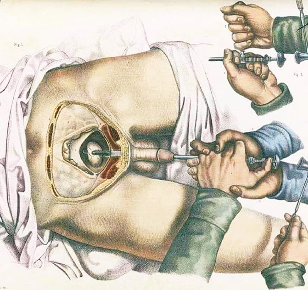 In 1824, lithotripsy consisted in passing a malleable metal catheter into the bladder and through this a long steel rod, bevelled at the end to form a fine chisel. Held it firm against the bladder wall, and tapped the rod with a hammer, without anesthesia of course.