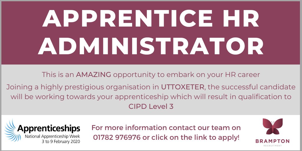 #Uttoxeter! Make sure you contact us or send your CV in today to avoid missing out! https://www.bramptonrecruitment.co.uk/job-search/job-detail/job-hr-administrator-apprenticeship-level-3-permanent-5299-1621 …#NAW2020#LookBeyond#Apprenticeships#HR#HRjobs#HRCareerpic.twitter.com/rhocIAU4pq