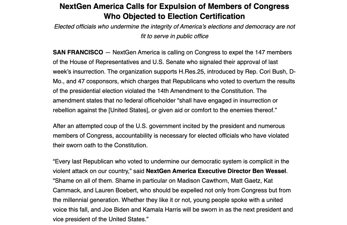 @NextGenAmerica calls for expulsion of: •@RobWittman#VA01 •@RepMGriffith#VA09 •@RepBenCline#VA06 •@RepBobGood#VA05 “Every last Republican who voted to undermine our democratic system is complicit in the violent attack on our country,” says@BenWesselpic.twitter.com/JzboAA8YE9