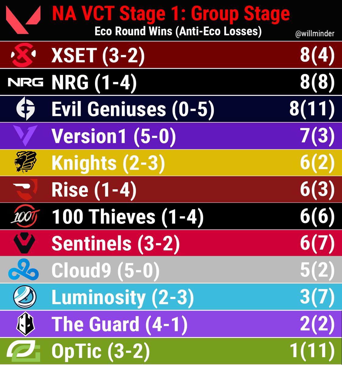 Here were the teams with the most Eco Round Wins. In parentheses, I added the number of rounds the team lost an Anti-Eco round.