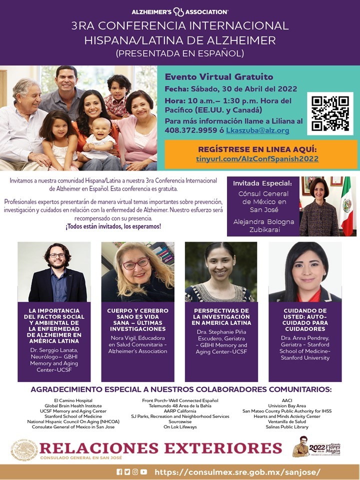 @consulmexsjo a través de nuestra#VDS y en colaboración con@AlzNorCalNorNev te invitan a la 3ra Conferencia Internacional Latina de Alzheimer, para toda los familiares y cuidadores de personas con Alzheimer. Regístrate es gratuito: http://tinyurl.com/yc7rx6we .@IME_SRE@SRE_mxpic.twitter.com/IGdjLl208K