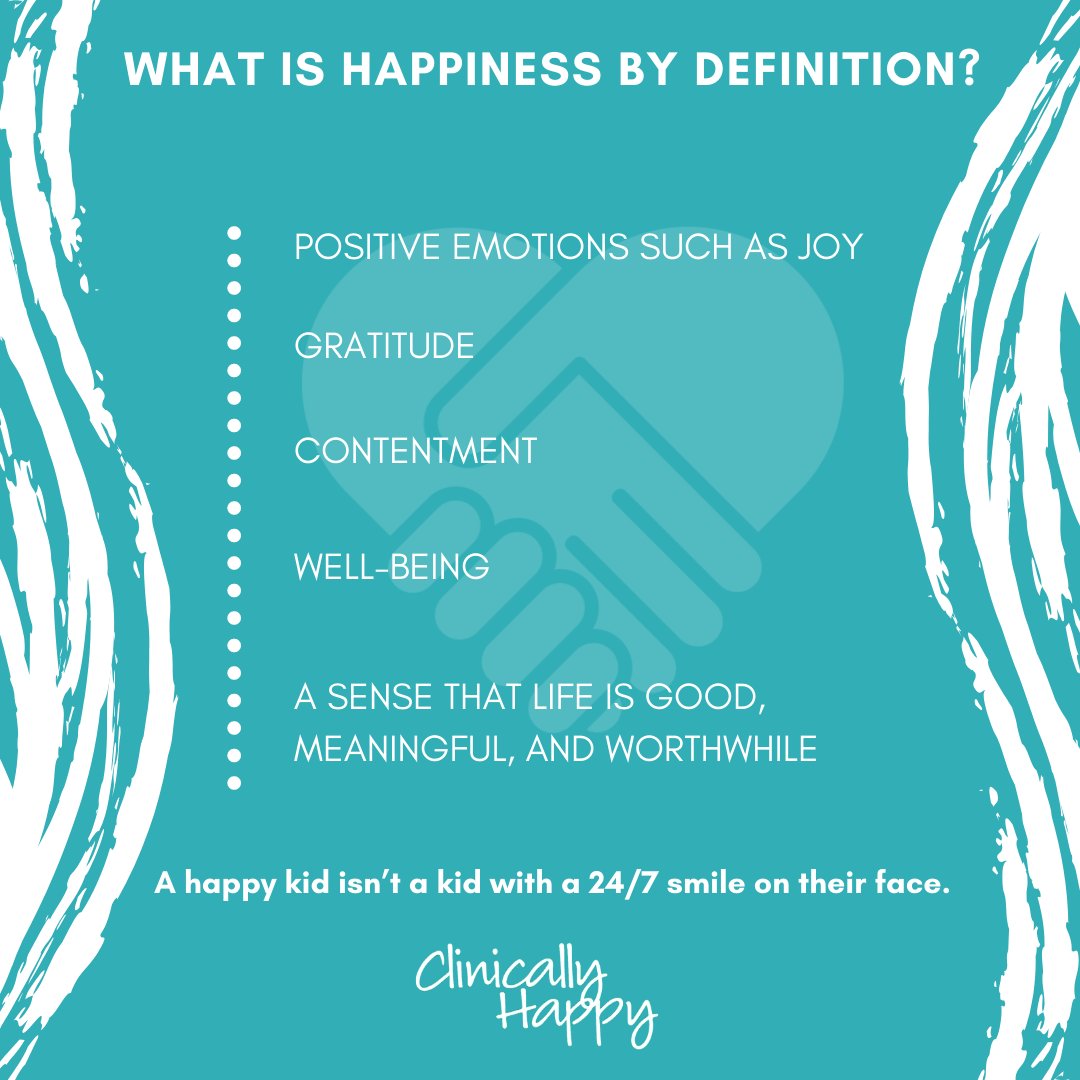 What is happiness by definition? Happiness can be seen through positive emotions such as joy, gratitude, contentment, well-being, and a sense that life is good, meaningful, and worthwhile! Remember: a happy child isn't a child with a constant, 24/7 smile on their face.