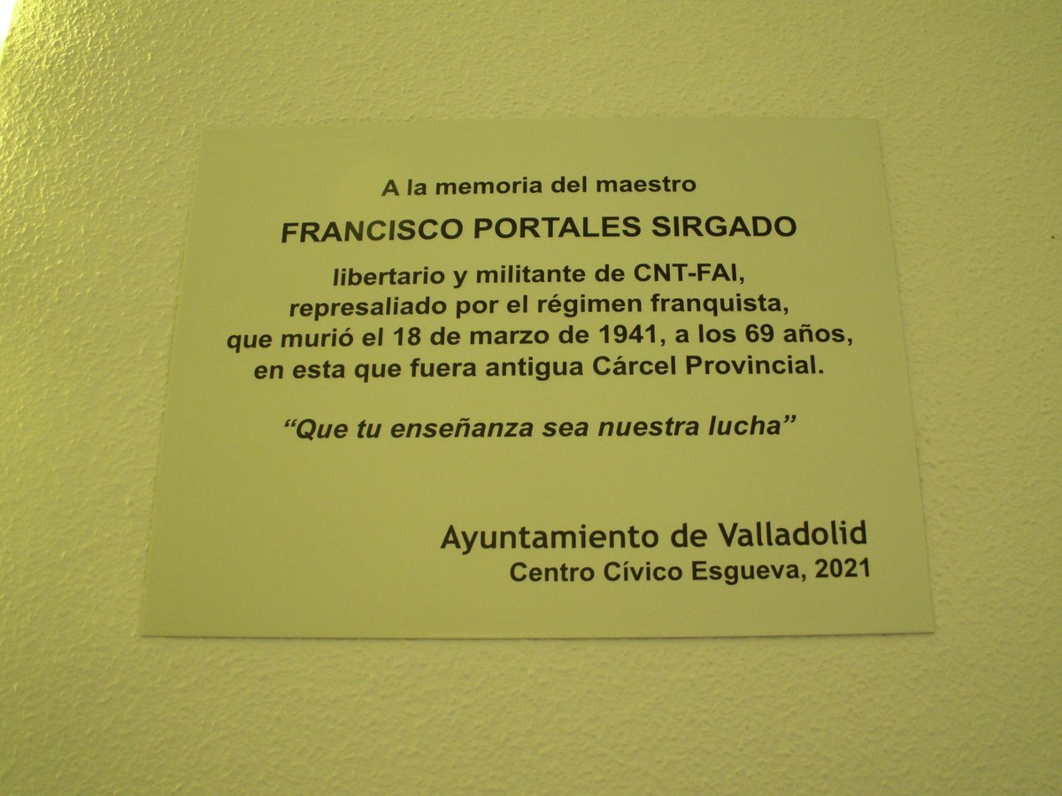 MEMORIA ES LUCHA | En #Valladolid, el recuerdo de que el acogedor Centro Cívico Esgueva de@AyuntamientoVLL fue cárcel fascista ya es más que palabra; este 2 de julio salió a la luz la placa por el maestro libertario Francisco Portales, muerto allí por el franquismo en 1941.pic.twitter.com/c9nJkae8od
