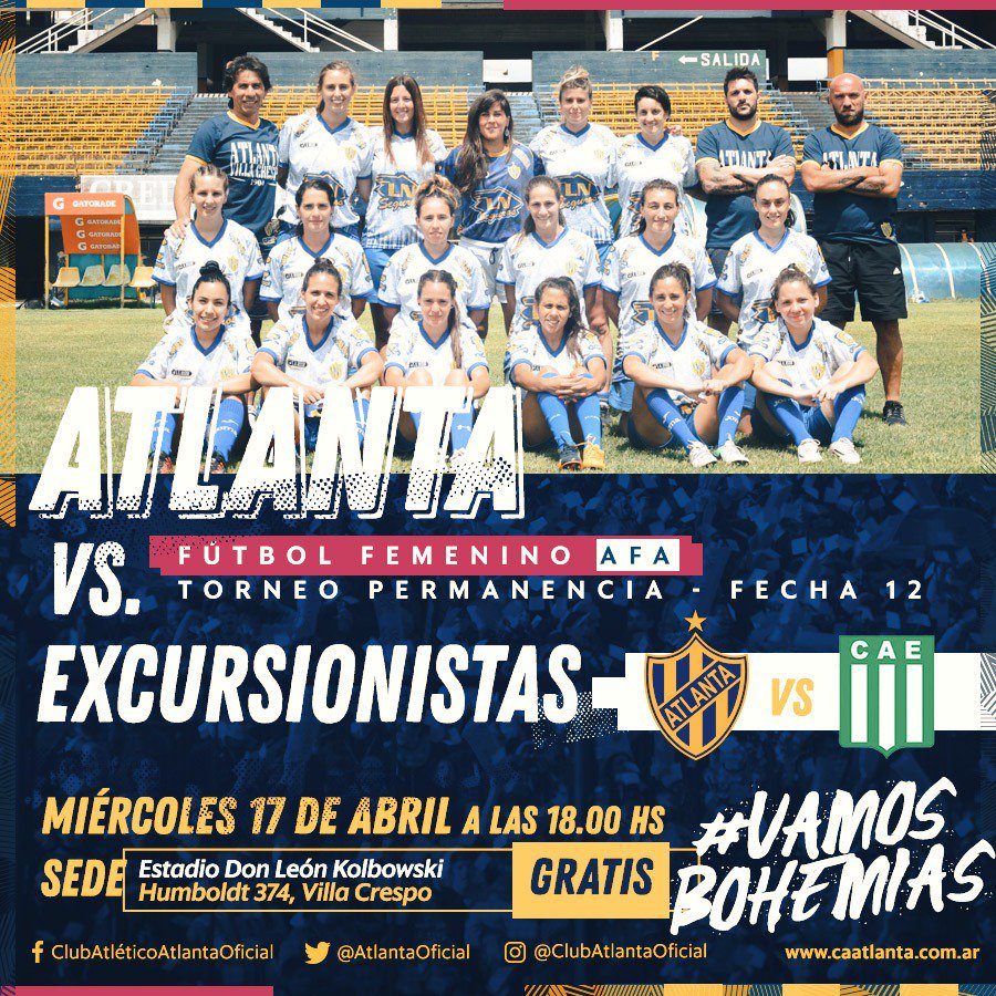 #Atlanta enfrentan a#Excursionistas Esta tarde , a las 18 hs en el León con entrada gratuita, partido clave por la permanencia.#VamosBohemias pic.twitter.com/pT1jF1jKa1