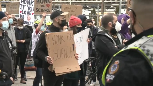 Bicycle & pedestrian counter protesters turning back 3+ tucks @ Main&Dunsmuir viaduct