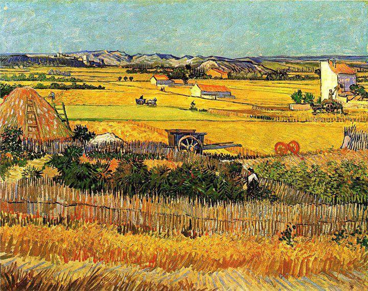 #VanGogh was enthralled by harvest fields turning ochre, yellow and bronze - here are two examples created in Arles between 1888-90. The notion of the field as a harbinger of time was ever on Vincent's mind and a ripened field signified the outcome of a productive life for him. pic.twitter.com/J3S8JyFJeY