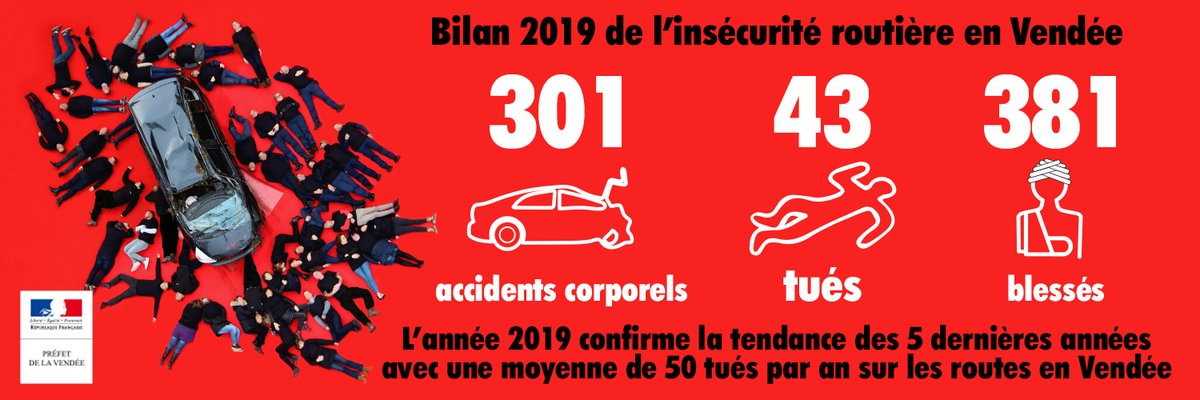 Bilan 2019 de l’insécurité routière en #Vendée : une incitation à poursuivre la mobilisation pour sauver des vies.@RoutePlusSure Retrouvez le communiqué de presse : http://www.vendee.gouv.fr/IMG/pdf/cp_bilan_2019_des_accidents_de_la_route_en_vendee_01-2020.pdf … pic.twitter.com/6VlsOuQNnb