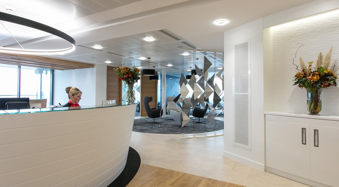 This conical reception counter finished in crown cut oak