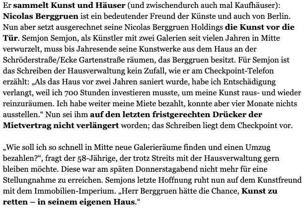 #Berggruen, der schon für die#Verdrängung einiger Kulturstandorte gesorgt hat: Künstler und Galerist Semjon Semjon muss bis Jahresende seine Kunstwerke aus dem Haus räumen via@TspCheckpoint#Kunst#Kultur#Berlin#Räumepic.twitter.com/v1yPpvL4lu