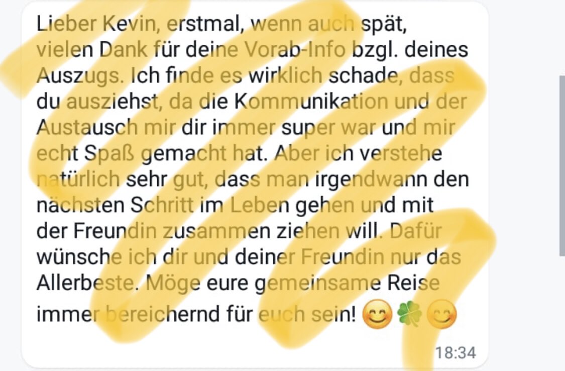 Als ich vor paar Wochen aus der WG gezogen bin, gab’s vom Vermieter nur ein trockenes „In Ordnung, alles Gute“, nun zieht mein Mitbewohner aus und bekommt einen ganzen Abschiedsroman mit herzzereißenden Liebeserklärung.. ok cool