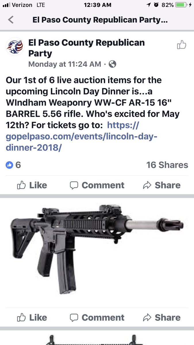 #Colorado is auctioning an AR15 at a $100 per plate fundraiser on May 12.#MothersDay weekend.#VetsResistSquadron#VetsVsTheNRA#GunControlNow#EnoughIsEnough#resist@maddow@Cruellaisdevine@amjoyshow@IronStache@jaketapperpic.twitter.com/HEwmBgsb5d