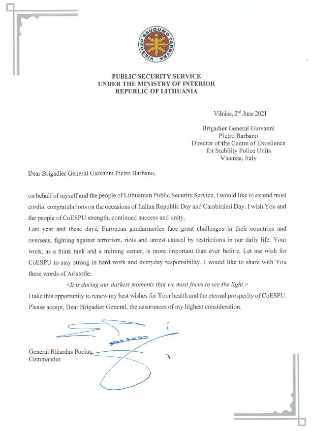#EUPFT at#CoESPU in#Vicenza, Gen. Ričardas Pocius, CDR of the Lithuanian PSS under the MoI, sent a very appreciated letter of congratulations to BG G.P. Barbano, CoESPU Director, on the Italian Republic Day on June 2nd. pic.twitter.com/pVcqX6UjOB