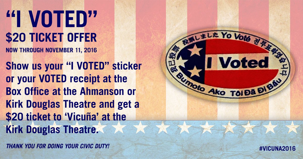 #vote next week (or by mail), show us your#IVoted sticker, and get a#Vicuna2016 $20 ticket#Vota#CAvotes http://myctg.la/2eF6cel pic.twitter.com/CoB7NRuZtx
