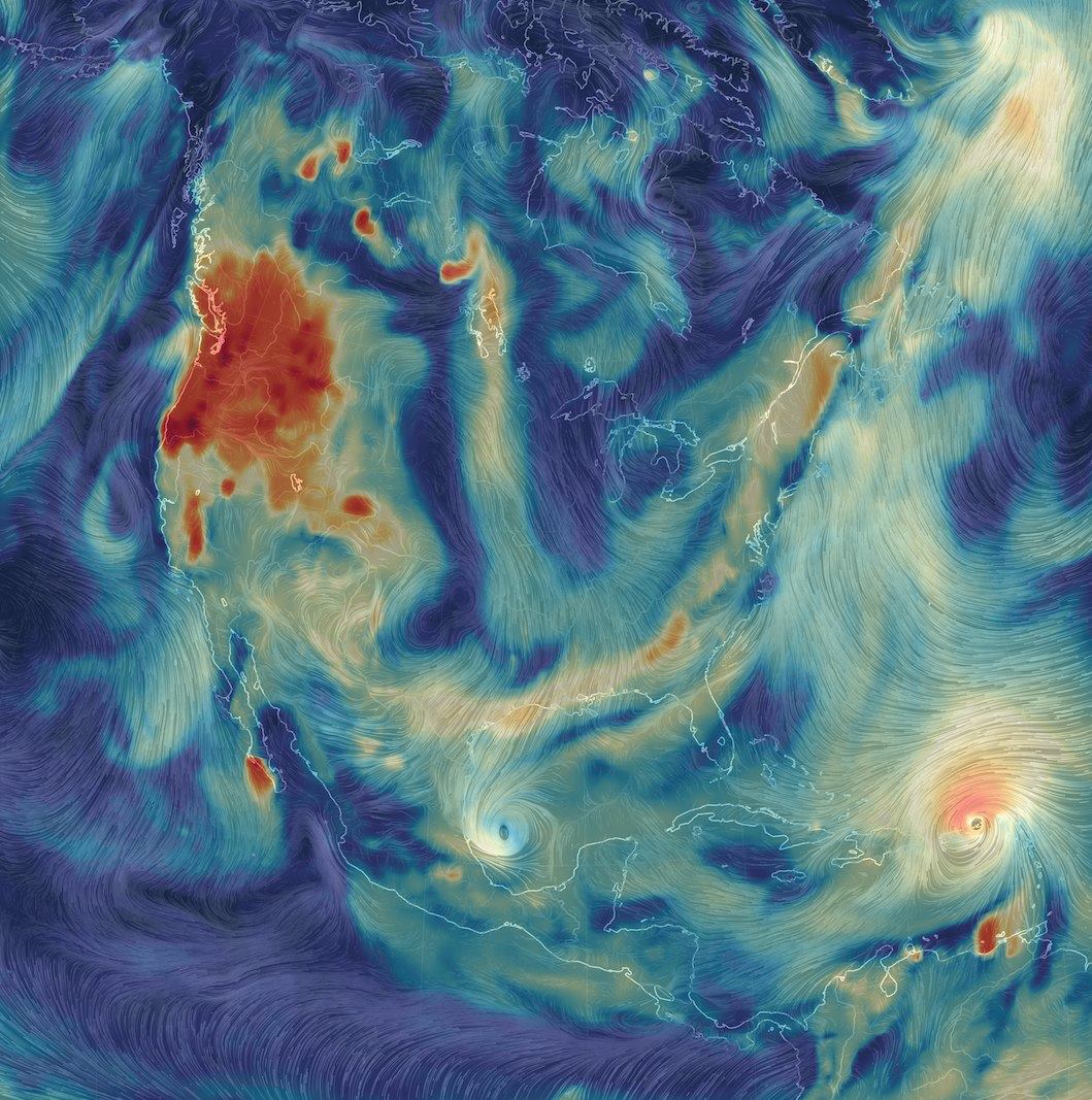 Particulates caused by wildfires in Western US during the US Wildfire season with Hurricane Katia (L) and Irma (R) via Earth artist Cameron Beccario captured on September 6 2017. http://earth.nullschool.net