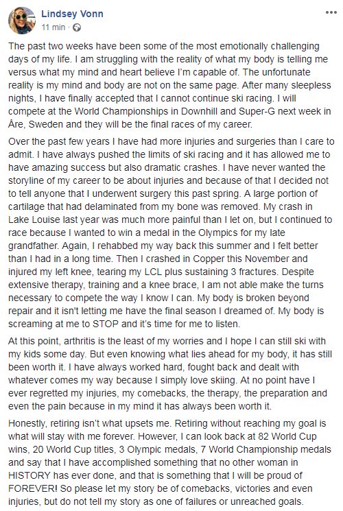 (34 ans, 82 victoires en Coupe du monde) vient d'annoncer, sur sa page Facebook, qu'elle mettra un terme à carrière après les Mondiaux d'Are, qui se tiendront du 4 au 19 février. pic.twitter.com/mhvHsIj0WT