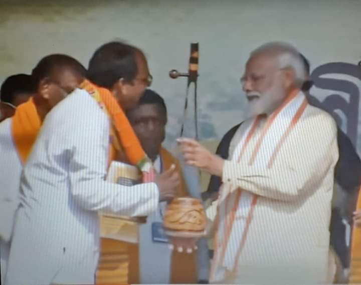 বোলপুর লোকসভার বিজেপি প্রাথী রামপ্রসাদ দাস প্রধান মন্ত্রীর হাতে একতারা তুলে দিচ্ছেন।