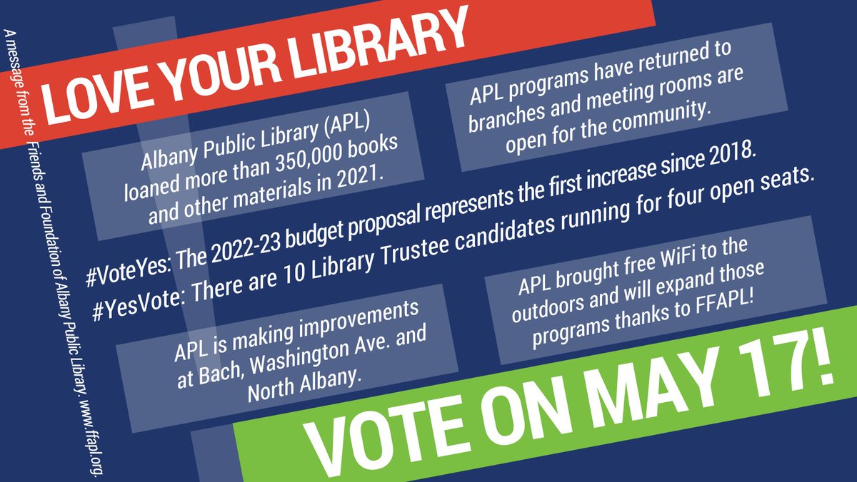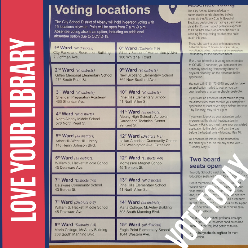 #vote for@AlbanyNYLibrary budget and trustees. Take a walk and enjoy the night air and#VoteYes on Proposition 4! Here is your polling place. pic.twitter.com/j0aQngv7YJ