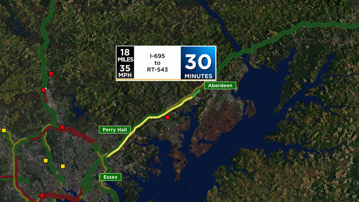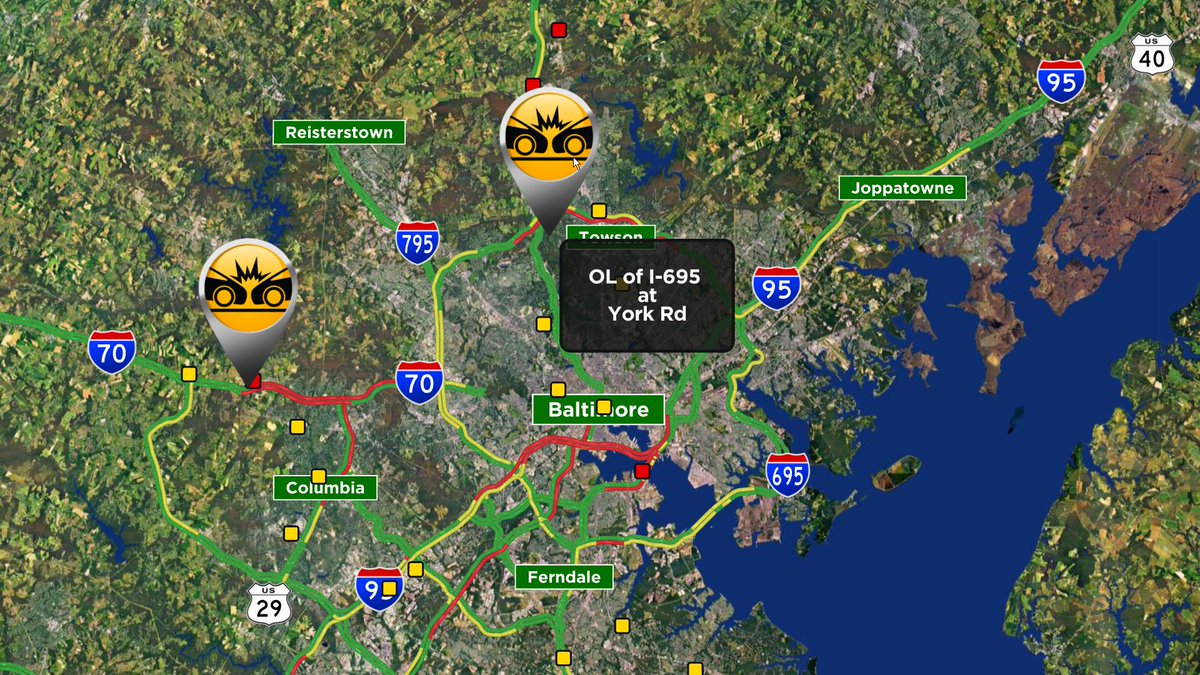 Delays on the OL of I-695 from Harford Rd. to Charles St.