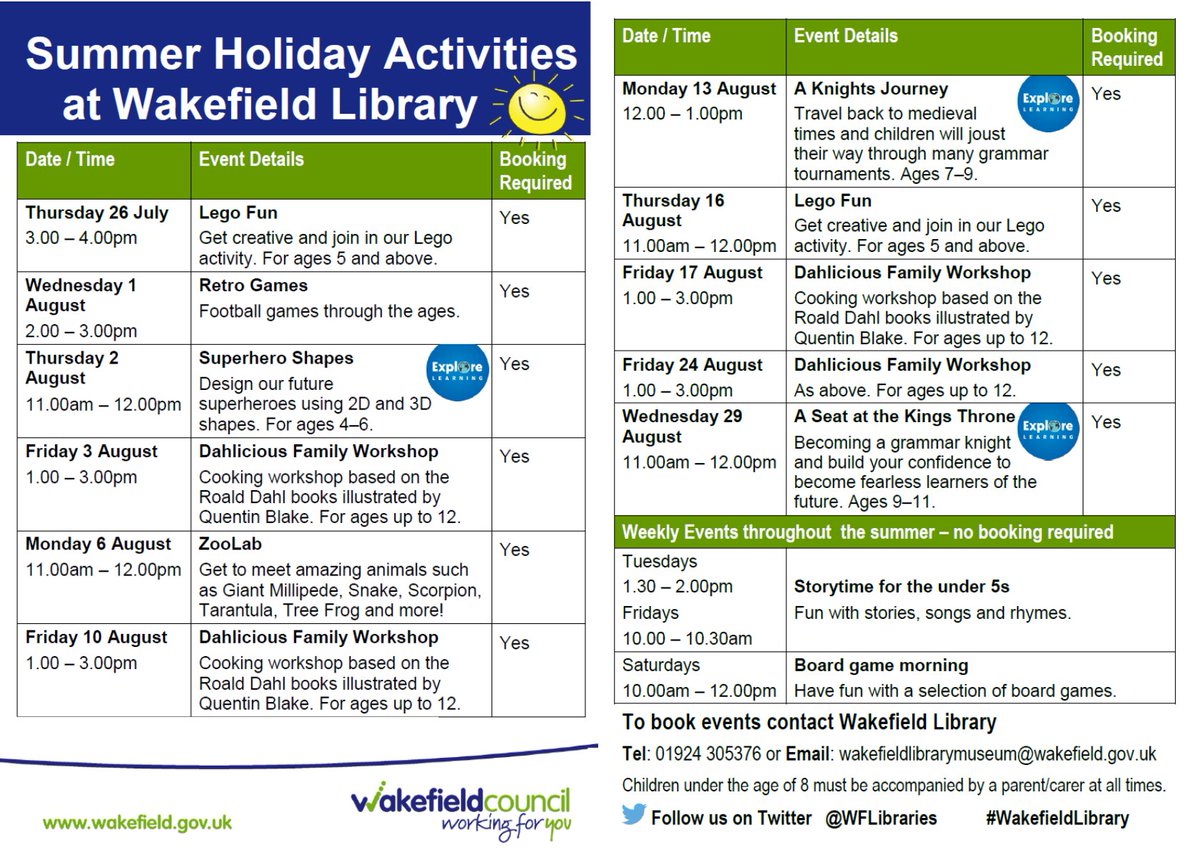 #WakefieldLibrary invites families to a range of free summer activities to keep the little kids and big kids busy! Bookings now being taken Tel: 01924 305376 pic.twitter.com/XImgspr5sk