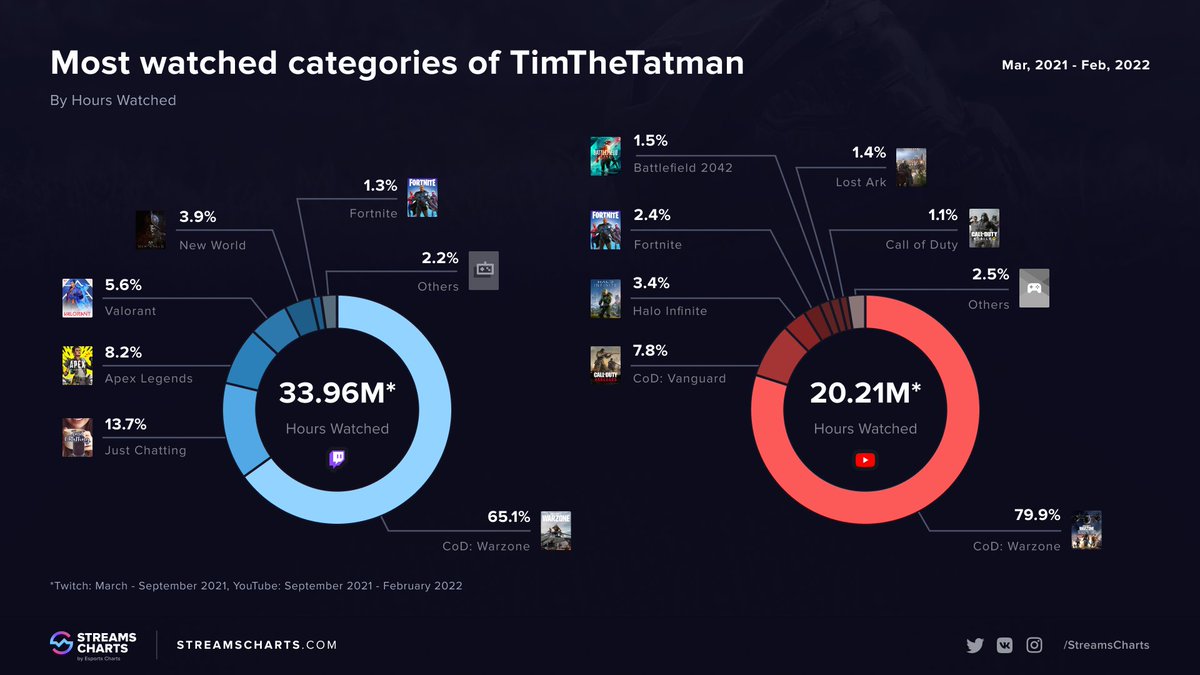 @timthetatman during first six months on YouTube Tim began to devote even more time to streaming#CallofDutyWarzone on YouTube: this category accounted for nearly 80% of his total Hours Watched. Read more: https://streamscharts.com/news/timthetatman-first-six-months-youtube …#TatmanArmy#WeAreCOL