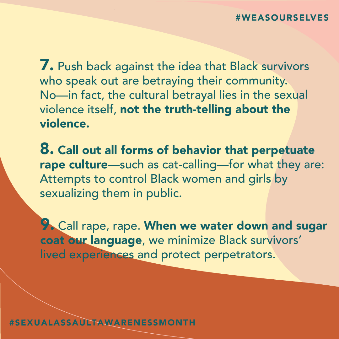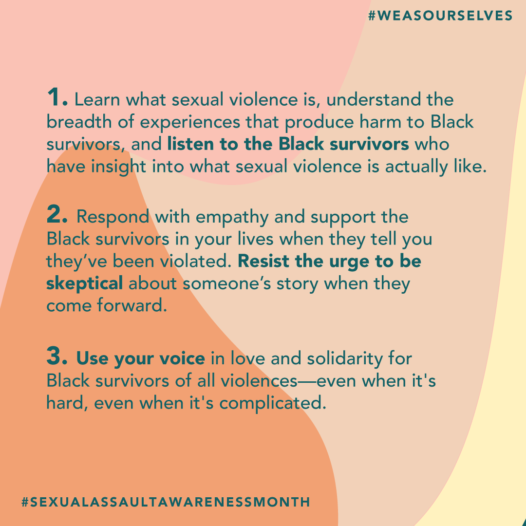 #SAAM is Black Survivors Week of Action. This week focuses on the voices & experiences of Black survivors, who are 3x times more likely to experience sexual violence than their white counterparts. Learn more: https://weasourselves.org/blacksaamweek/#BlackSAAMWeek#WeAsOurselves pic.twitter.com/zMswtpDZLX