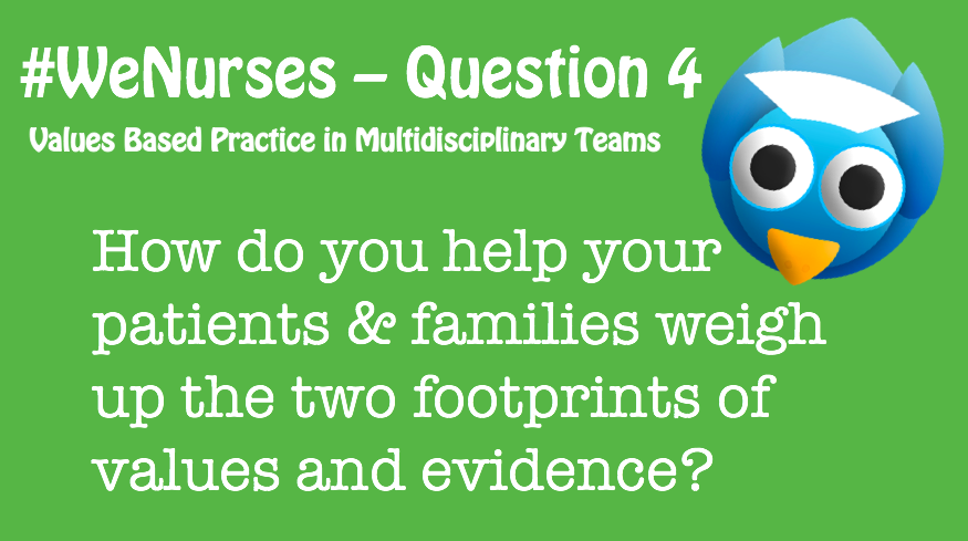 #WeNurses - How can we as healthcare professionals help patients and families weigh up values and evidence ? QUESTION 4 pic.twitter.com/0QvQdaGJxs