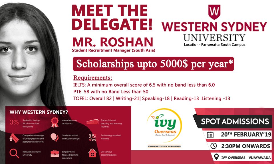 #Westernsydneyuniversity are cordially invited along with your parents and friends to attend the Delegate Interaction with Mr.Roshan, Student recruitment manager, South Asia on 20th Feb'19 at 2.30PM at IVY Overseas Vijayawada pic.twitter.com/JDa21abETX