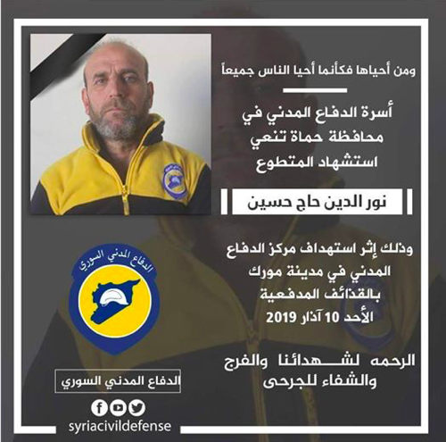 #WhiteHelmet volunteer got killed today by direct targeting work group of the volunteers by the military forces in Hama countryside. Noor Aldeen is the second volunteer was killed within 24 hours. pic.twitter.com/ekKnnaq3gl