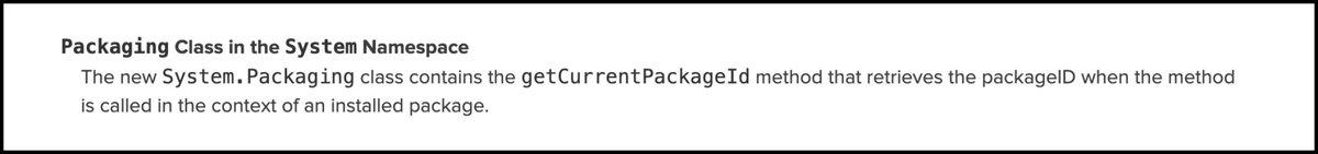 The new System.Packaging class contains the getCurrentPackageId method that retrieves the packageID when the method is called in the context of an installed package.