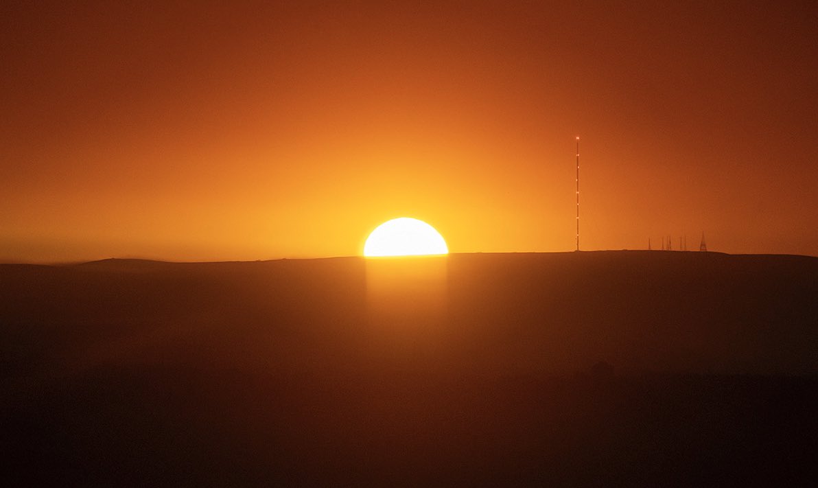 The sun setting behind Winter Hill, photographed from central