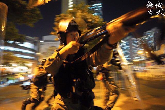 Riot police line up in Lung Cheung Road after releasing rounds of tear gas.