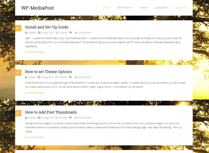 WP-MediaPost is a responsive clean and flat design WordPress blogging theme. The theme is centered around your blog posts and uses HTML5 & CSS3 code to keep it fast