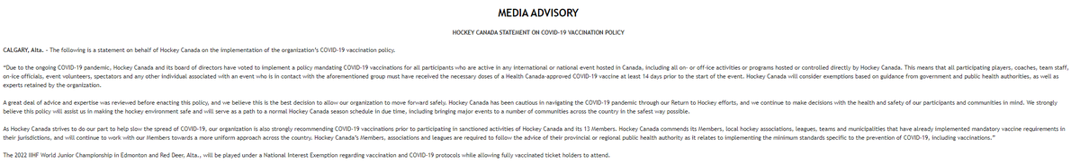 BREAKING: Hockey Canada mandates that all participants must be vaccinated against COVID-19 to compete in any international or national event played on Canadian ice. This applies to the World Juniors happening in December/January in Alberta.