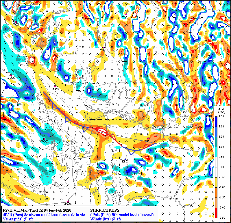 Low level vertical motion field shows frontogenesis on the S side of the valley extending as convergence over the Strait tomorrow morning providing a first guess of the general location of the rain snow boundary